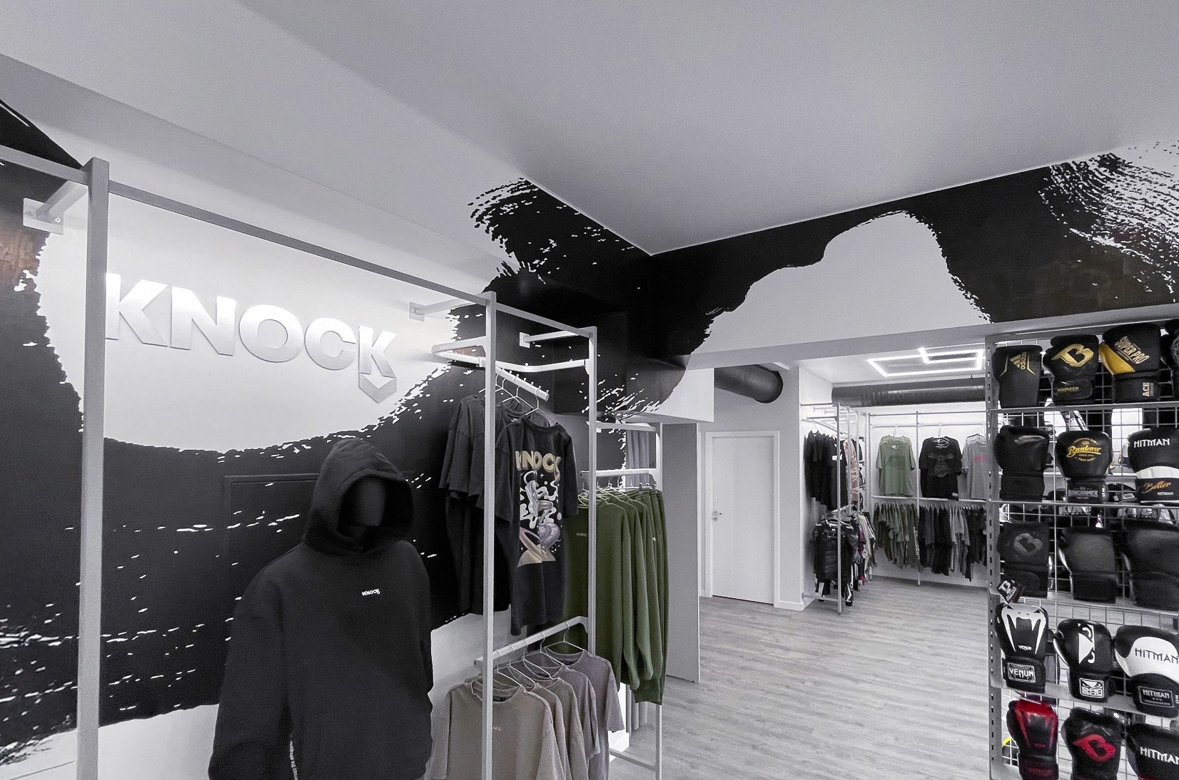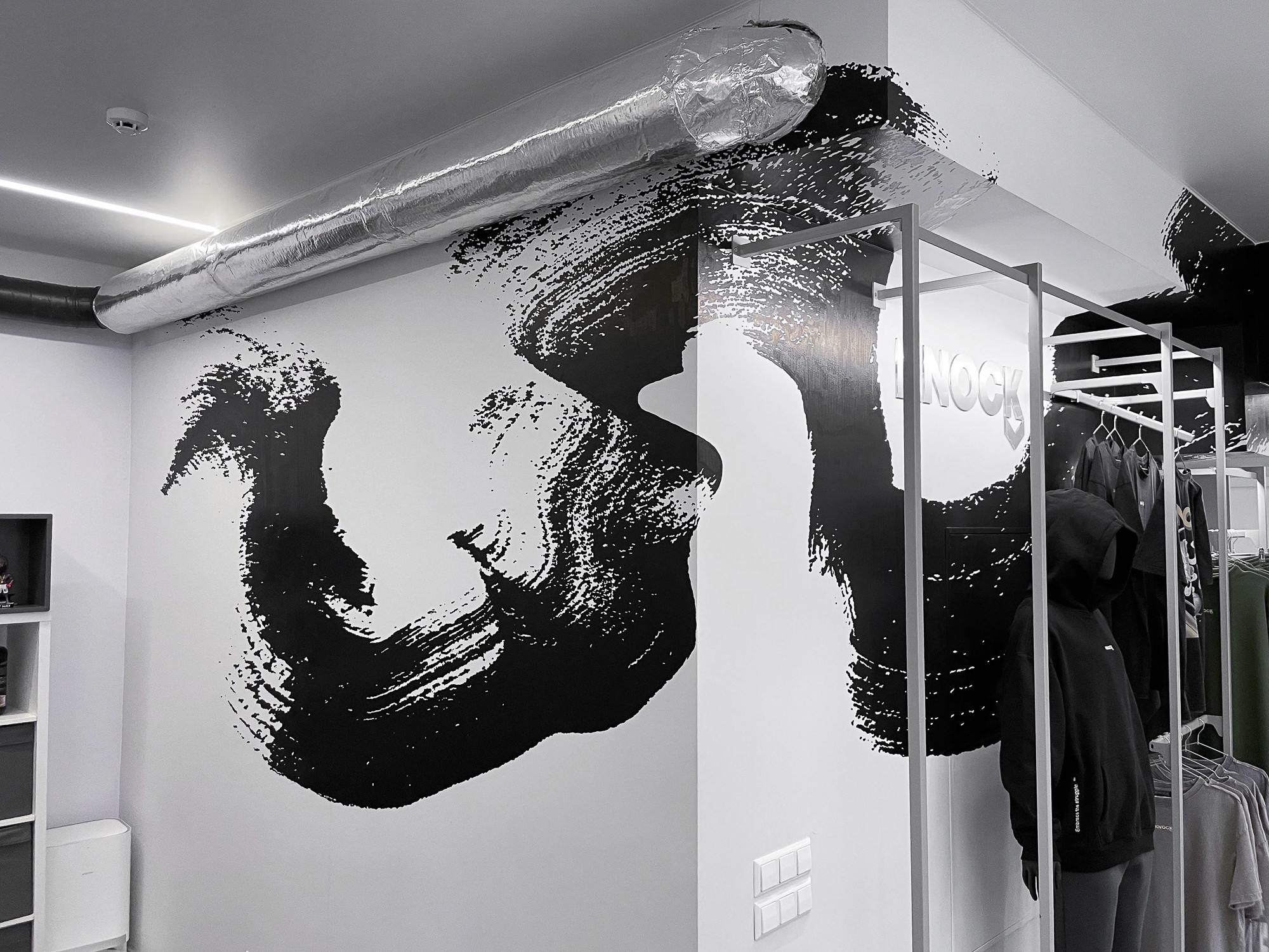 Interior mural and brand collaboration developed for the Fighter Shop and KNOCK apparel brand. The project began with a hand-drawn wall intervention, which later became the visual foundation for the KNOCK tag lettering and a series of graphic applications across clothing and packaging. The collaboration demonstrates how a site-specific gesture was translated into a coherent brand language across physical space and products. Lithuania