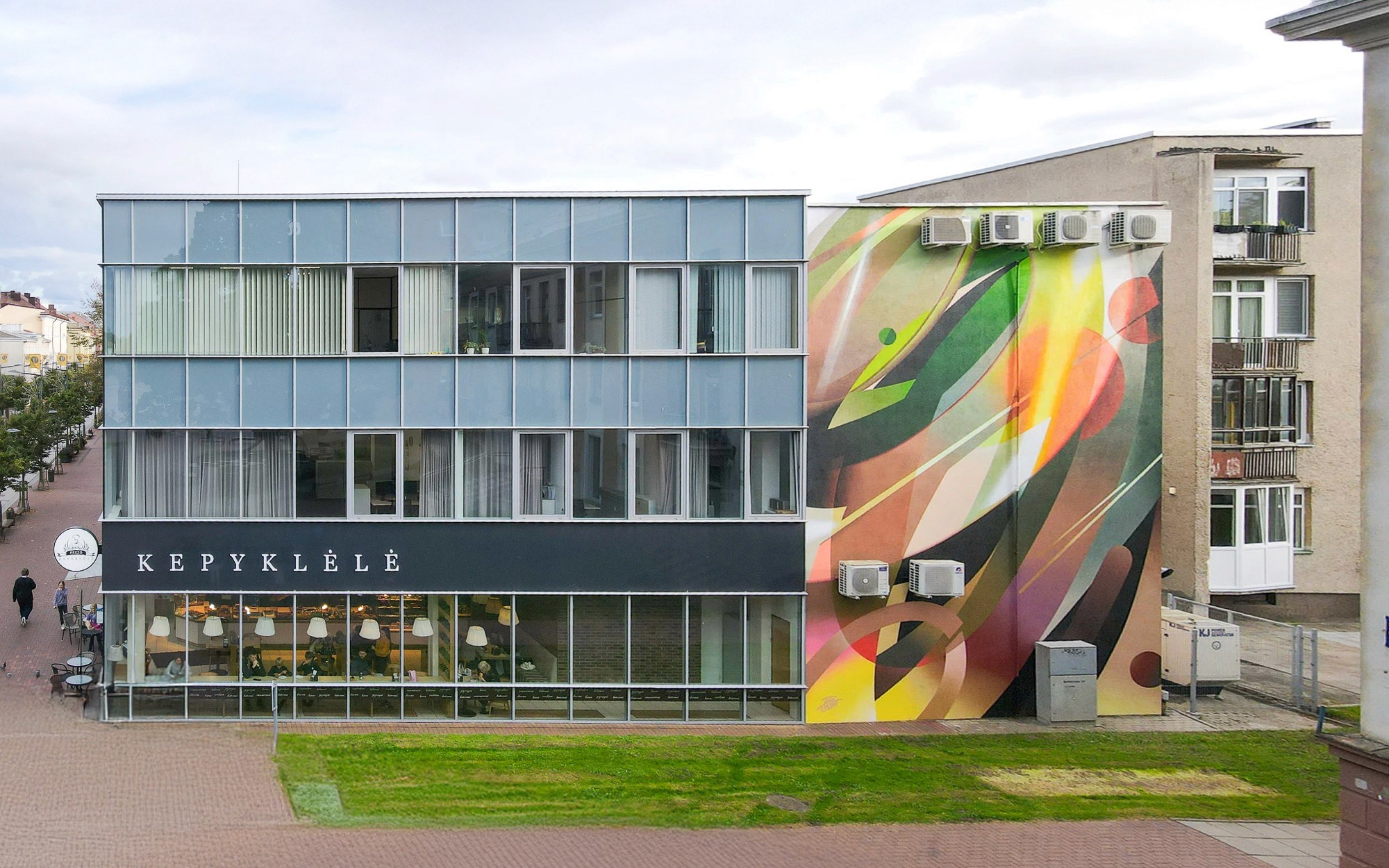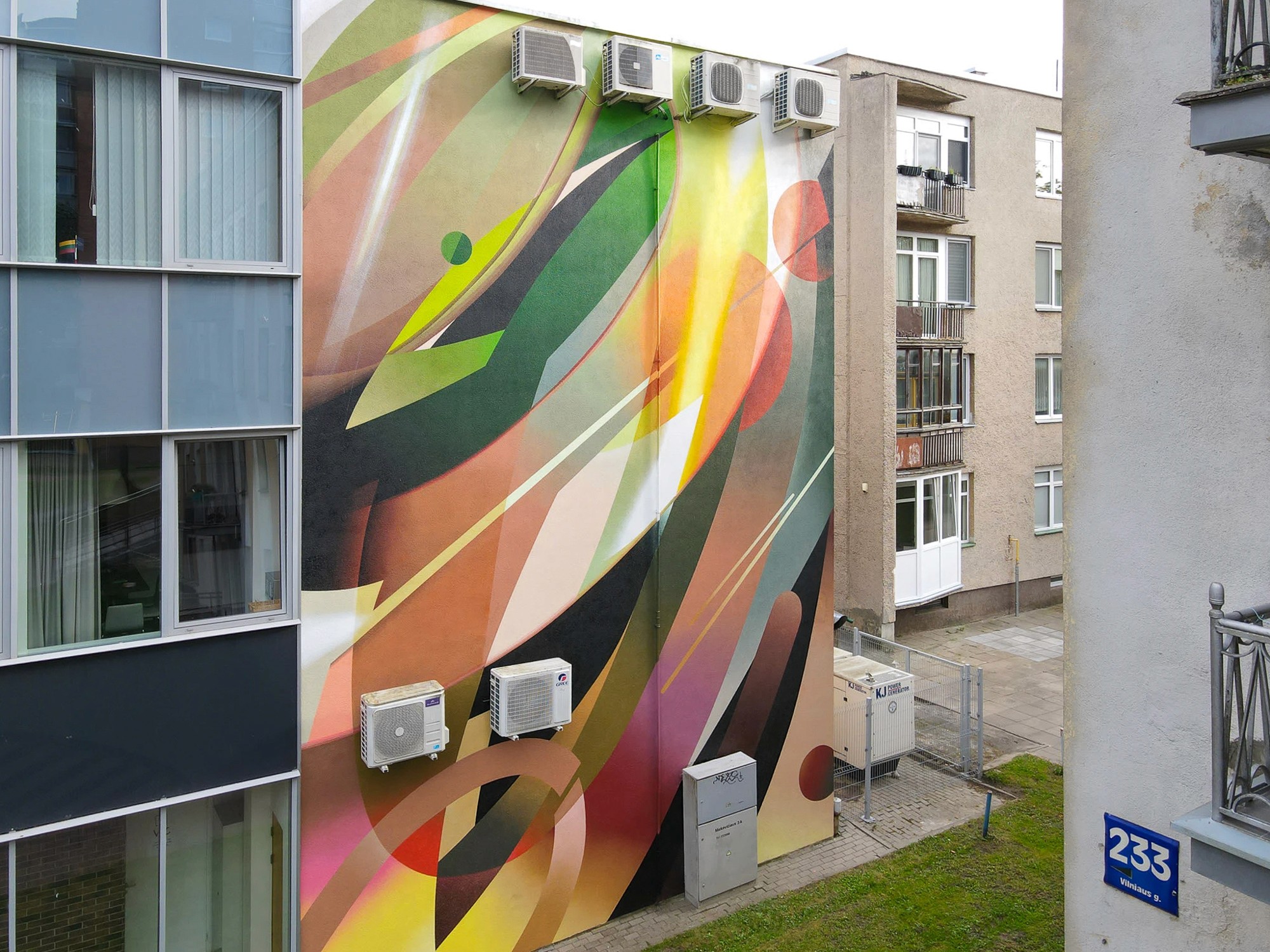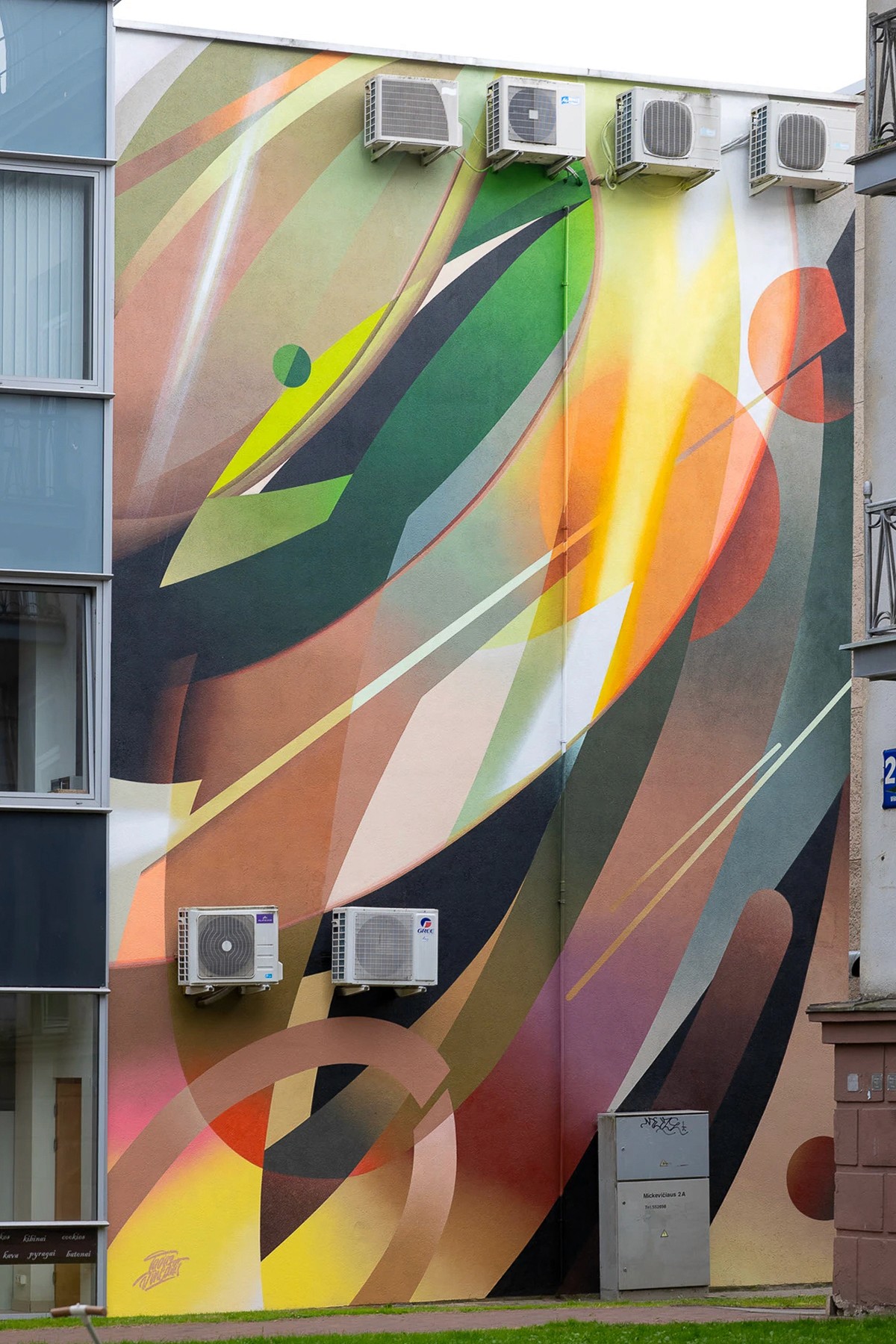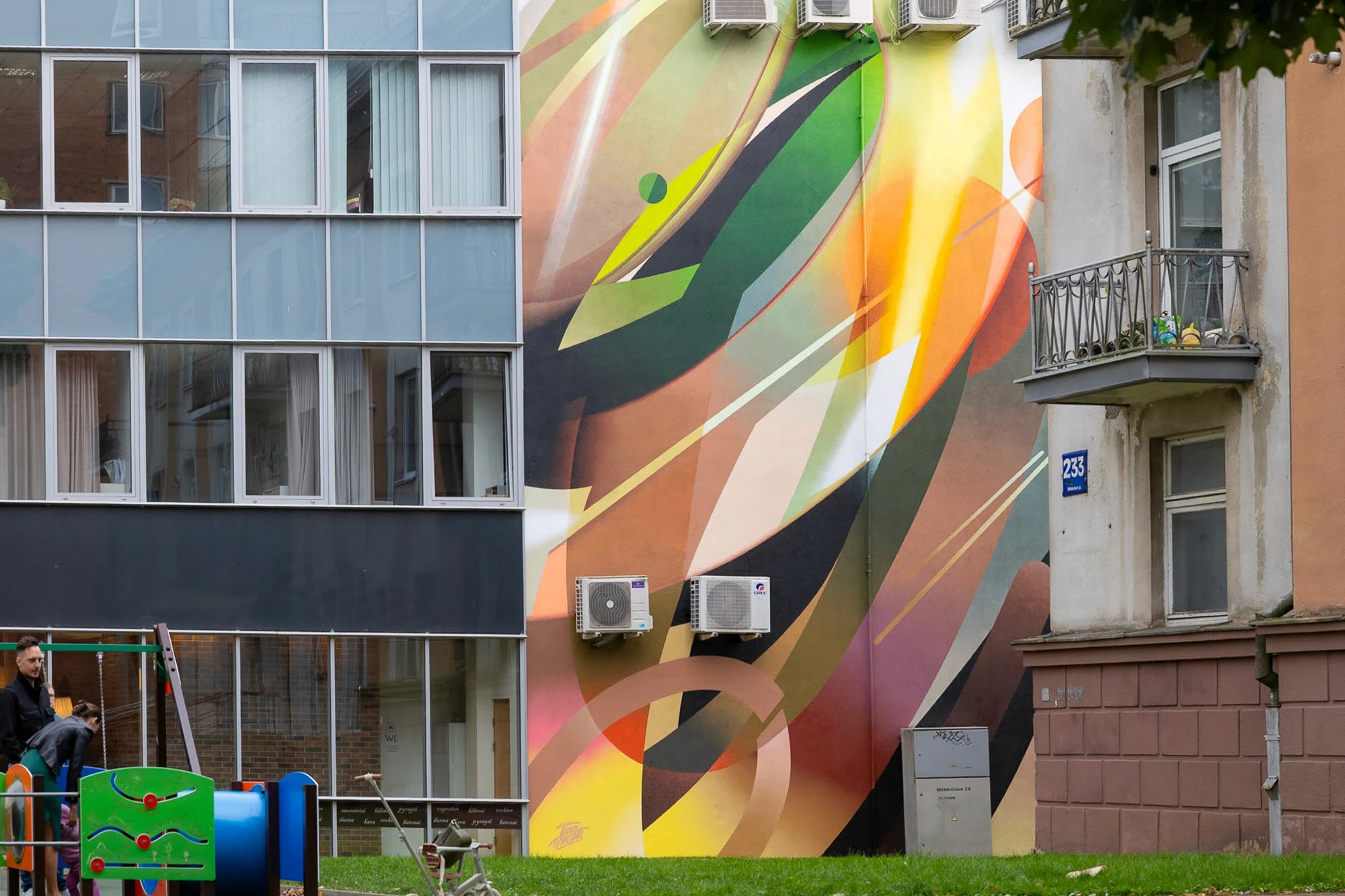 Public art mural created during the Šiauliai City Exhibition Hall street art plein air “Kidnapping of the Sun.” The work responds to the event theme through an abstract composition exploring a fleeting moment of intensity and transformation. Layered shapes and saturated color transitions create a sense of movement and pause, leaving interpretation open to the viewer. Šiauliai, Lithuania — “Flash”